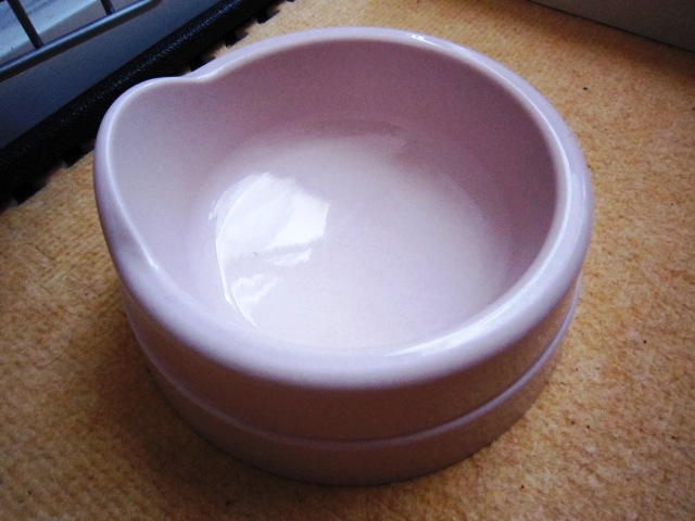 食器はピンクの台形型(?)と金属のハンガー型(?)のどっちにするか悩んだのですが、とりあえず100均で台形型を買って試してみました。ピンクはくうには大きすぎてご飯が逃げるし、耳が入って汚れそうだったので、あっさりハンガー型に。