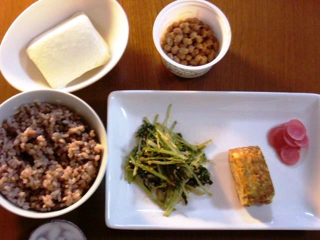蒸し豆腐、納豆、雑穀玄米、水菜のナムル、切干大根入り卵焼き(自家冷凍)、ラディッシュの甘酢漬け