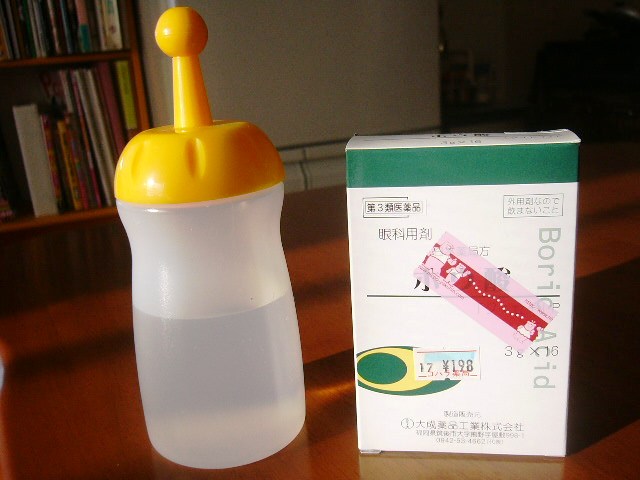 くうは涙やけ(目の周りが茶色に変色すること)が気になるので、毎日何回か拭いてます。最近、涙やけに良いという、ホウ酸水を試してます。ホウ酸は薬局で200円弱。3gのホウ酸を150ccのお湯で溶いて、100均で買った容器に入れました。ホウ酸水は目薬にもなるらしいです。