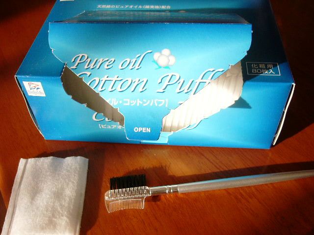 くうを仰向けに抱っこした状態で、ホウ酸水で濡らしたコットンで目元を拭いて、毛に絡まってとれない目やには人間のまゆげコームで取ってます。