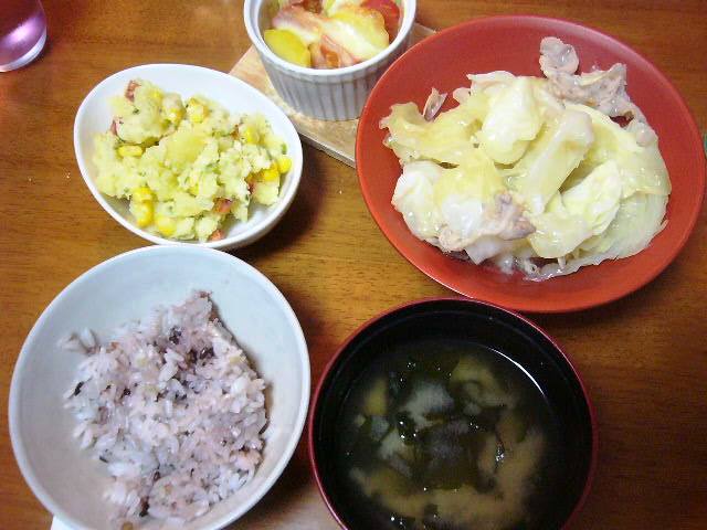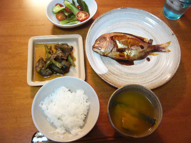 たたきキュウリとトマトの胡麻油和え、昨日の残りの茄子と豚肉の煮物、煮魚、白米、かぼちゃの味噌汁、デザートに桃と手作りアイス