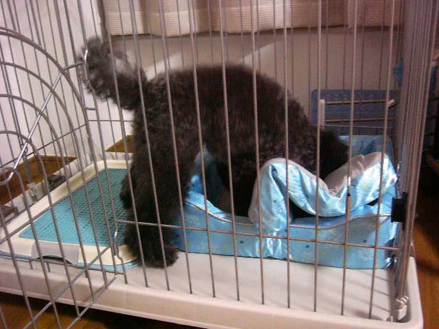 アイリスオーヤマの保冷剤が入れられるベッド(保冷剤は入れてません)ですが、カバーが布じゃなくてビニールっぽいので、「何これ?!」と興奮したようです。朝には破壊されてそうな予感がしたので取り上げました。ベッド代わりにタオルを入れて、今日はおやすみなさい~