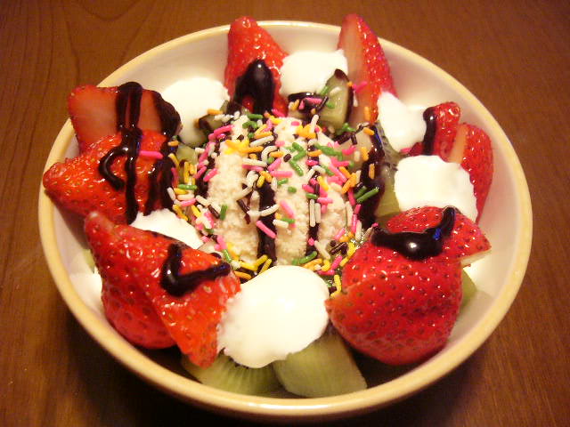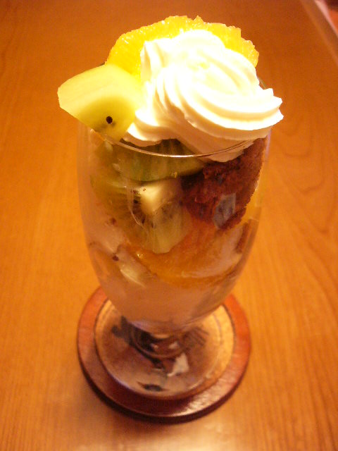 昨日作ったアイスと、アイスを作る時に残った生クリームと、この間のチョコロールの切れ端(冷凍してた)と、家にある果物でパフェ。やっぱりどう盛り付けていいのかわからん; でもパフェって目の前にあると幸せになる食べ物だなぁ・・・と思いました。