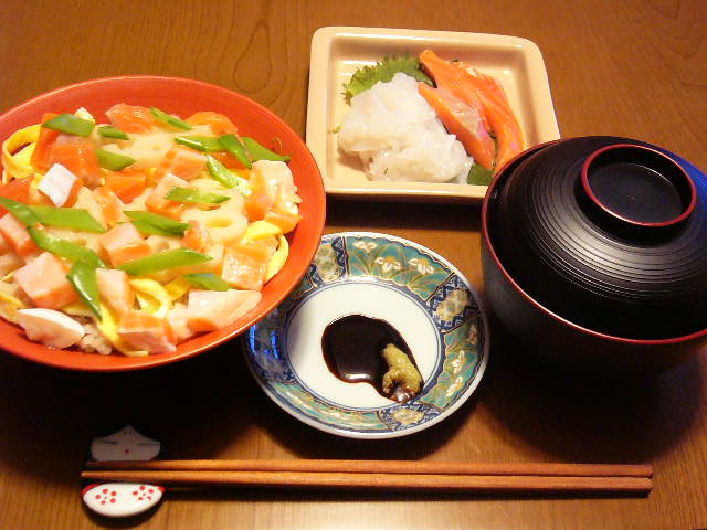 一日遅れのひな祭り(?) 散らし寿司、刺身、味噌汁