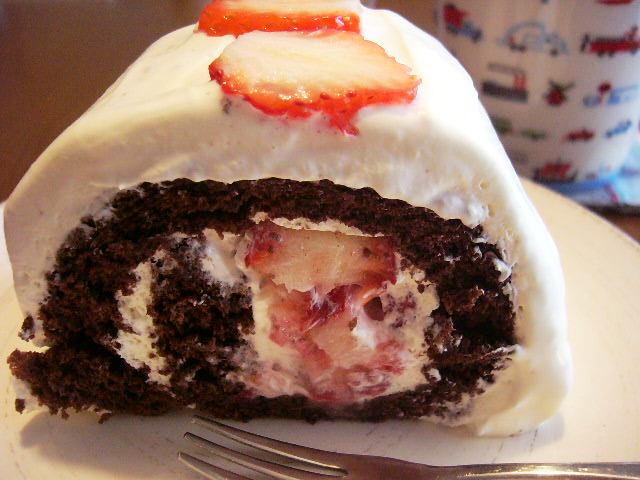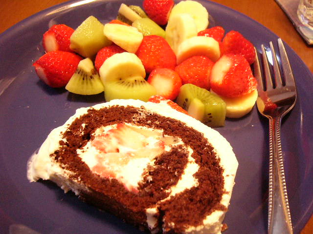 カレーの後のデザートです。フルーツとチョコロール。おしゃれに盛り付けとかムリ。 でもこのケーキ、見た目はイマイチだけど、スポンジがほんとおいしい。