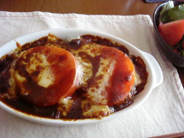 トマトとチーズを乗せて焼きカレー、ベビーリーフとトマト