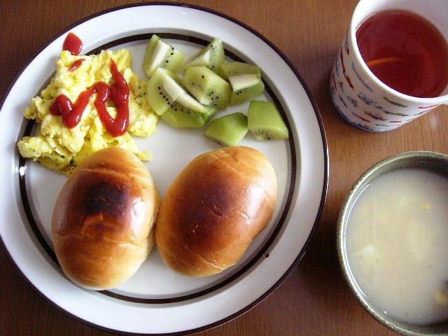 スクランブルエッグ、キウイ、ロールパン、シチュー、レモンティー