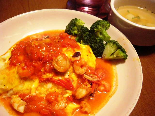 魚介とトマトのオムライス、ブロッコリー、野菜スープ