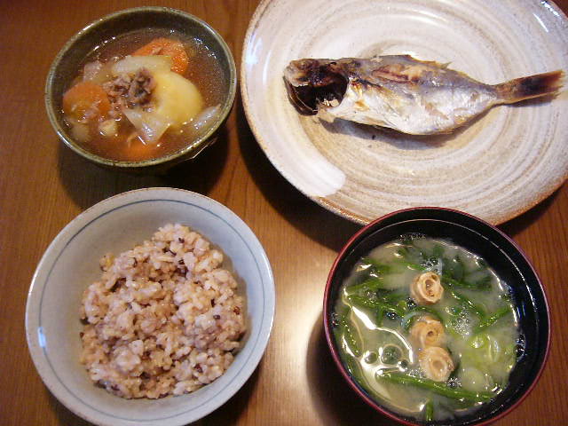ツナじゃが、魚の一夜干し、雑穀入り玄米、味噌汁