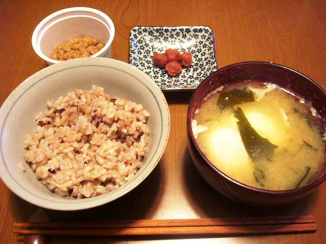 納豆、梅干し、雑穀入り五分つき米、卵とわかめの味噌汁