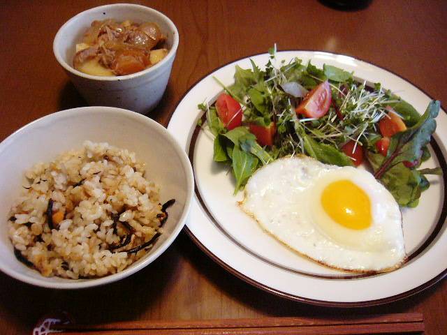ツナじゃが、サラダ、目玉焼き、ひじきご飯