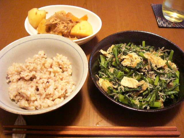 ツナじゃが、雑穀入り玄米、春菊とじゃこの炒め物