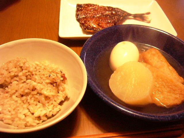 白和え、子持ちカレイの煮付け、雑穀入り五分つき米、蕪と白菜の味噌汁