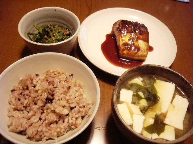 ホウレン草の胡麻和え、サバの味噌煮、雑穀入り五分つき米、味噌汁