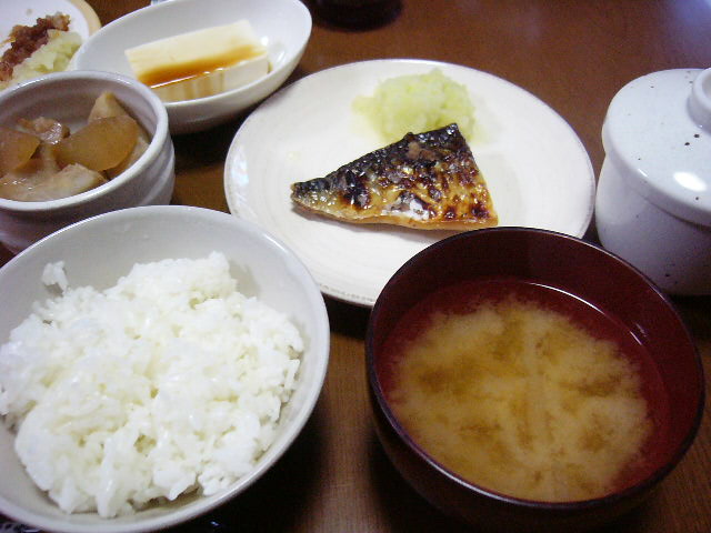 温奴、里芋と大根の煮物、塩サバ、白米、味噌汁、具なし茶碗蒸し