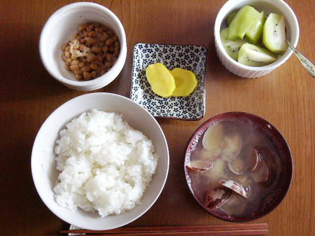 納豆、たくあん、白米、あさりの味噌汁、ジュース代わりにキウイ