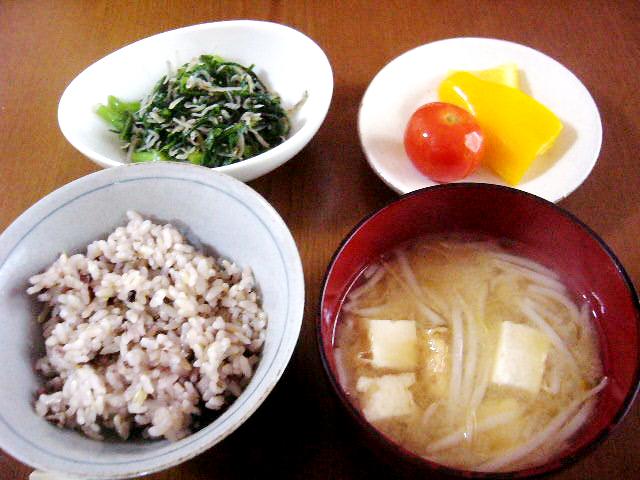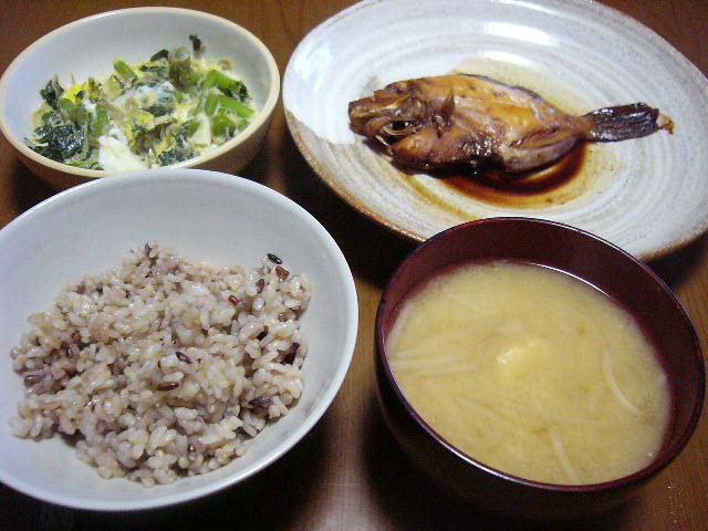 春菊としらすの炒め物(朝の残り)を卵でとじたもの、煮魚、雑穀入り五分付き米、味噌汁