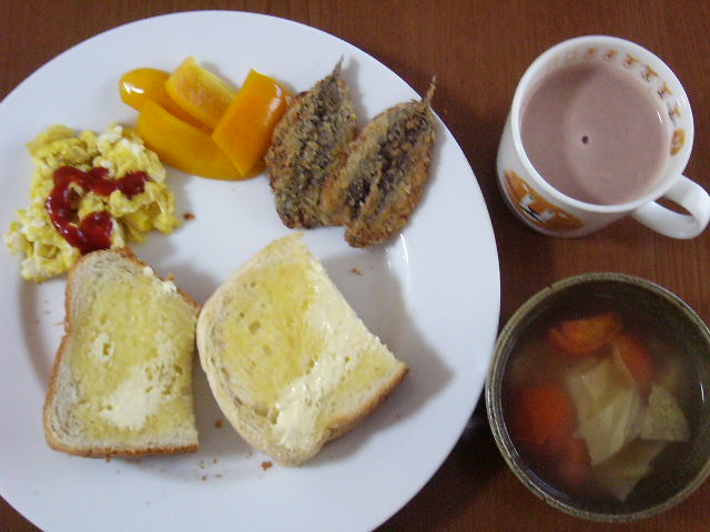 スクランブルエッグ、ピクルス、小イワシのフライ、バタートースト、野菜スープ、ココア