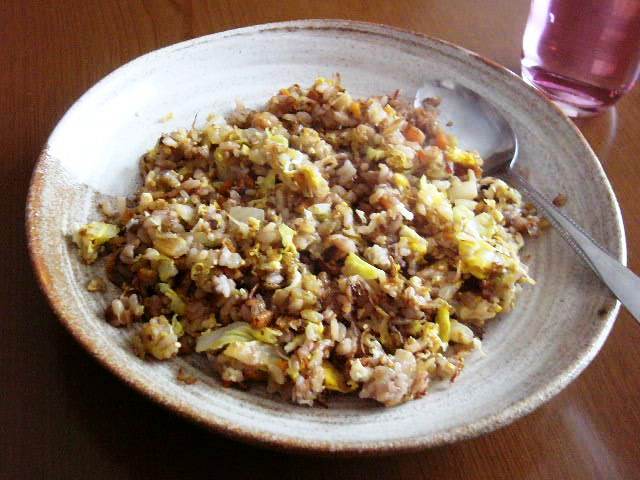 胡麻油でじゃこをカリカリに炒めて、ニンジンと白菜を投入。解凍した雑穀入り5分つき米と胡麻と卵とカツオ節を追加して、焦がした醤油と塩コショウで味付け。適当に作ったわりにはまともな味。