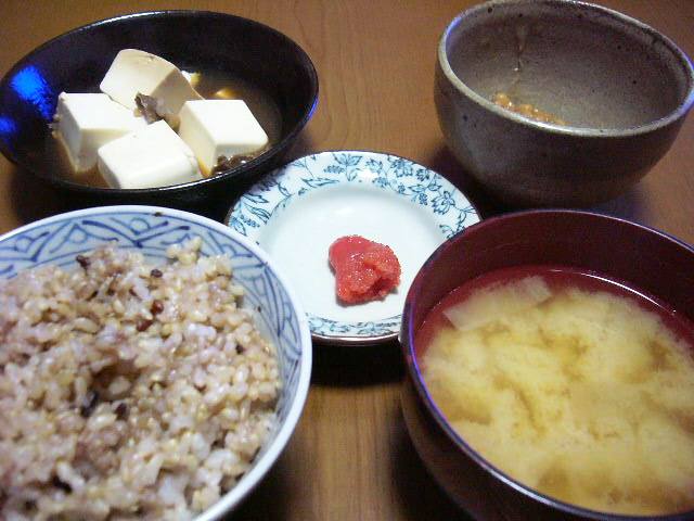 肉豆腐、明太子、納豆、雑穀入り玄米、味噌汁