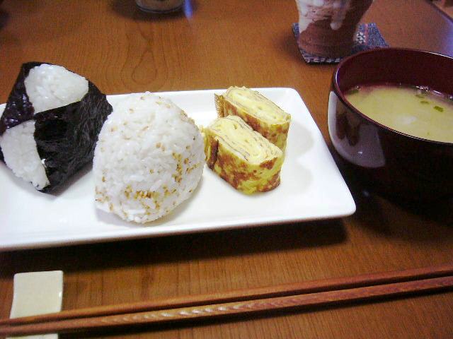 おにぎり(海苔+明太子、胡麻+梅干し)、だし巻き卵、味噌汁