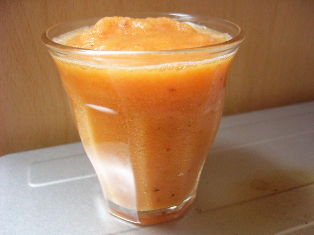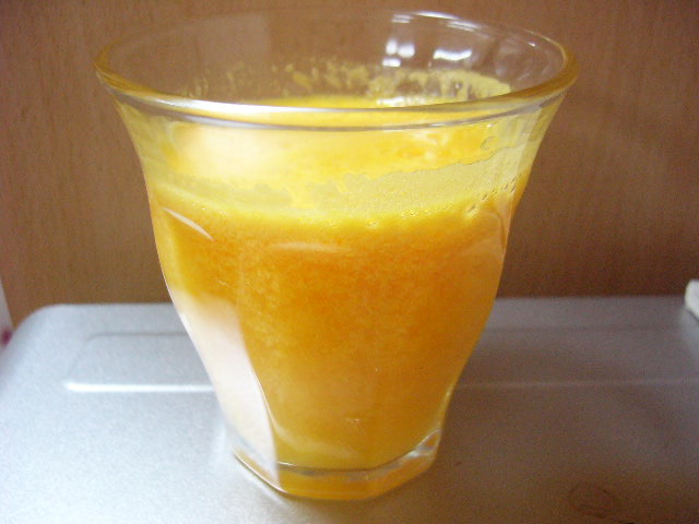 リンゴ+みかん+レモン。写真を撮る段階で、「?いつもより黄色い??」と思ったら・・・ニンジン入れ忘れてました(笑) みかんを多めに入れると、砂糖なんて入れてないのに甘ったるい!というくらい甘くなります。すごい。