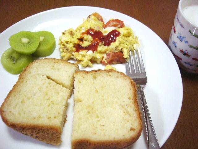 キウイ、トマト入りスクランブルエッグ、バナナブレッド、ホットミルク