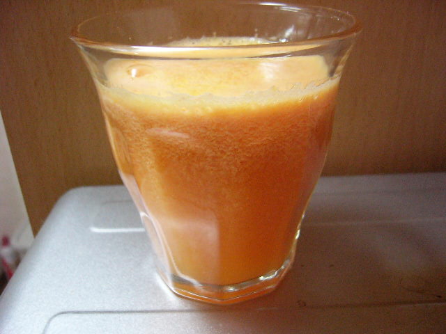 材料はミキサーの方が、リンゴ+ニンジン+ミニトマト+レモン汁+水(入れないと回らない)。本を読まずに適当に作ったのがいけなかったのかしら; いつも入れるみかんは皮が邪魔で入れられず、レモンも手絞りで、リンゴ類も細かく切らなければいけません。めんどう。搾りかすが出ないのは素晴らしいけど、手間や味を考えるとやっぱりジューサーが好きだなぁ。