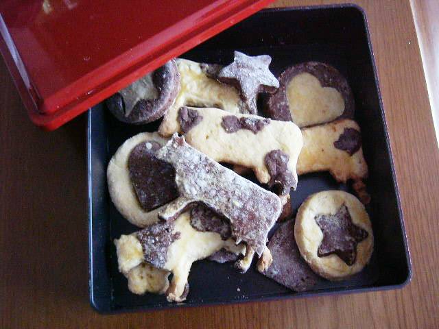15年ぶりくらいにココア生地のクッキーを作ったんですが、失敗。打ち粉で白く汚れたようになってる~(写真の中央の牛さんは、ココア生地100%で作ってます・・) あと焼く前に卵白を塗ったり塗らなかったりと試してみたけど、塗ると汚くなるみたいなので今回は塗らないほうが良さそうでした。。よかったぶっつけ本番じゃなくて。クッキー生地は多めに作って冷凍したのでお正月は楽チンです♪