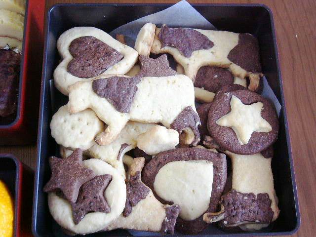 クッキーが食べたいけど寒いから買いに行くのはイヤ~と、夜中にクッキーを焼きました。クリスマスから高カロリーなモンばっか食べすぎ;; それは置いといて・・・そーいえば牛のクッキー型があったし、来年は牛どしだし、いくら小さめお重でも夫婦2人で3段は必要なさそう・・・3段目に牛さんクッキーを詰めてお正月に出してみようか?と思いつきました。