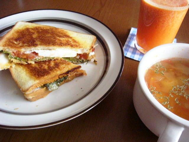 ホットサンド、トマトのスープ、ジュースはトマト+にんじん+みかん+レモン