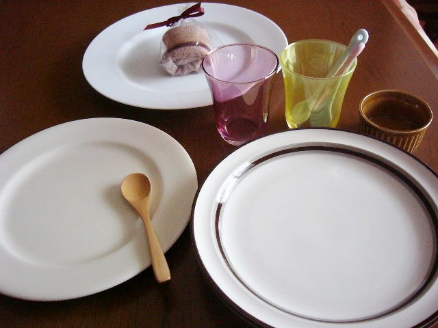 右手前のラインが入ったお皿が欲しくて、つい。今持ってるお皿は殆どが結婚当時(5年前)に買った物で、そろそろ飽きたし、実は端が欠けてたりしてるし。。