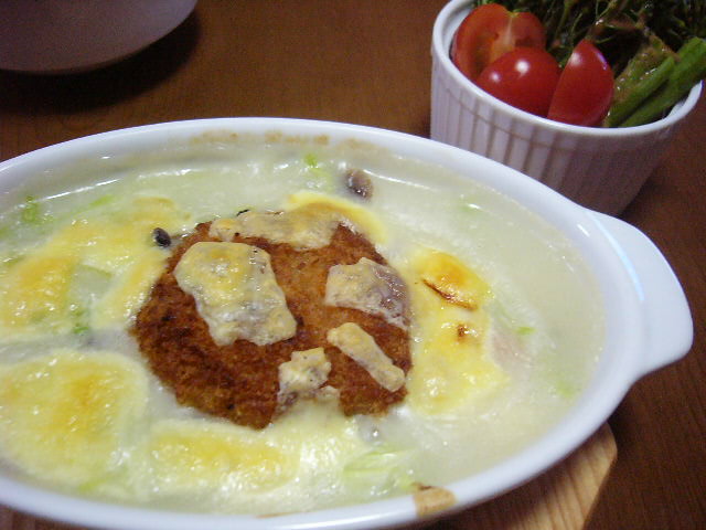 グラコロはこうちゃんのHPで見かけたのをうろ覚えで再現。つーかシチューにカニコロッケを投入してチーズをかけて焼いただけ・・・ひどい外見ですが、こうちゃんレシピはおいしそうでしたよ(念のため)。