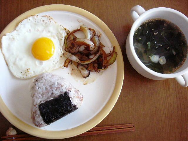 目玉焼き、焼肉のタレで炒めた玉葱、雑穀おにぎり、わかめスープ