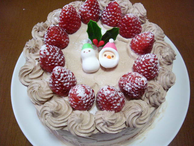 ケーキ焼きました!直前までブッシュドノエルにしようか迷ってたけど、COOKPADを参考に見てたら、「いかにも」なケーキにしてみたくなって作りました。チョコレートのプレートがあったら、もっとそれらしくなったかもしれないのに~残念。しかし夫婦2人しかいないのに、1ホールは量が多かった; まだ残ってる~