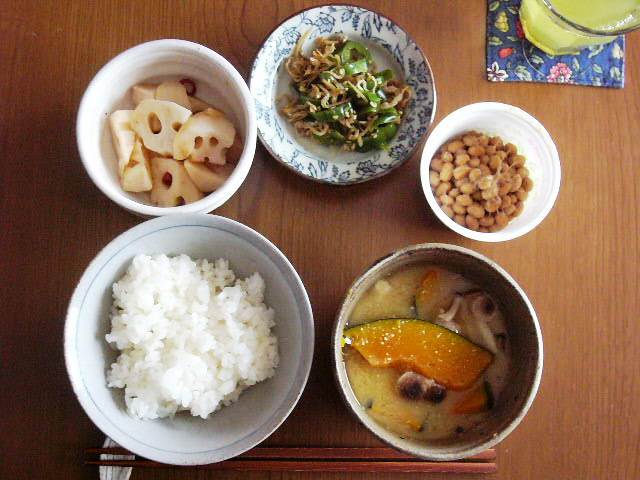 レンコンのあっさり煮、ピーマンとじゃこの甘辛炒め、納豆、白米、カボチャとしめじの味噌汁