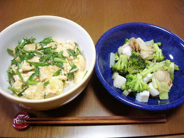 麻婆丼、ブロッコリーと魚介の塩炒め
