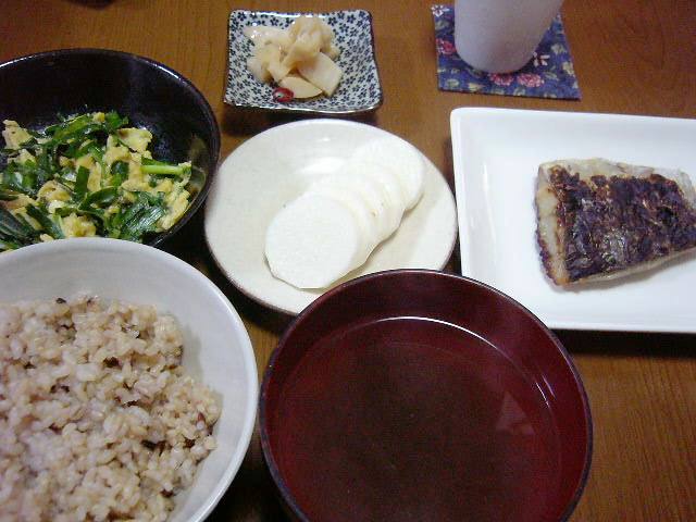 ニラの卵とじ、レンコンのあっさり煮、長いもスライス、さごしの味噌漬け、雑穀入り玄米、とろろ昆布の吸い物