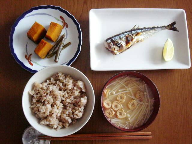 かぼちゃの煮物、サンマ、雑穀入り玄米、味噌汁