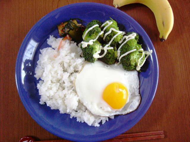 キムチ、ブロッコリー、白米、目玉焼き、ジュース代わりにバナナ
