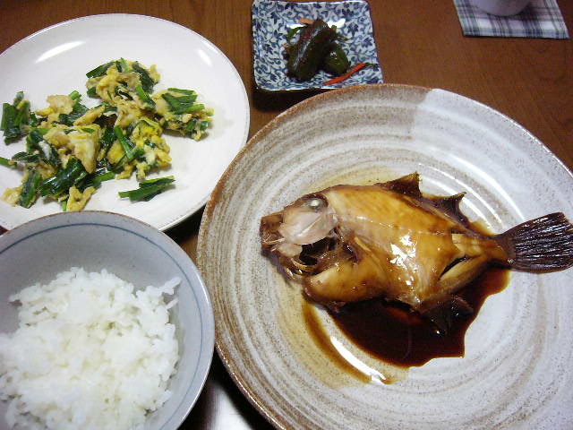ニラの卵とじ、キムチ、白米、カワハギの煮付け