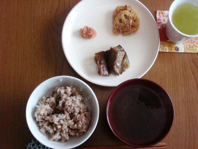 焼き明太子、レンコンの甘辛炒め(七味)、茄子と豚肉の煮物、雑穀入り玄米、とろろ汁