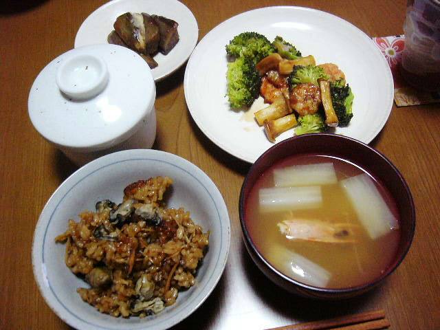 茄子と豚肉の煮物、茶碗蒸し、