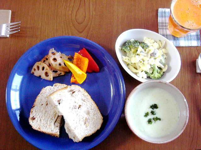 揚げレンコン、カラーピーマンのピクルス、胡桃と干しぶどうのパン(HB)、サラダ、ブロッコリーの茎でポタージュ、ジュース(リンゴ+みかん+ニンジン+レモン)