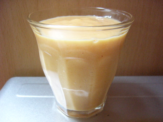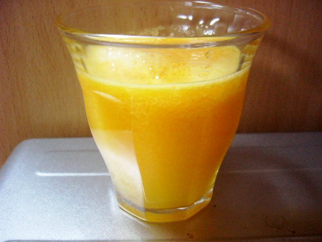 沖縄土産のパパイヤがやばくなってきたので、夜だけどジュース(というかシェイク)。パパイヤ+牛乳+砂糖小さじ1をミキサーで。 ・・・なんだかプリン液飲んでるみたいでした;