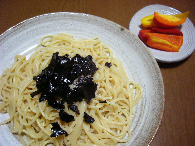 明太子パスタ、カラーピーマンのピクルス