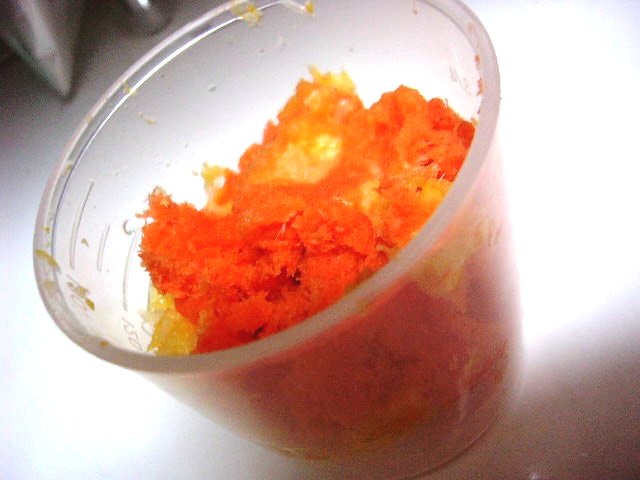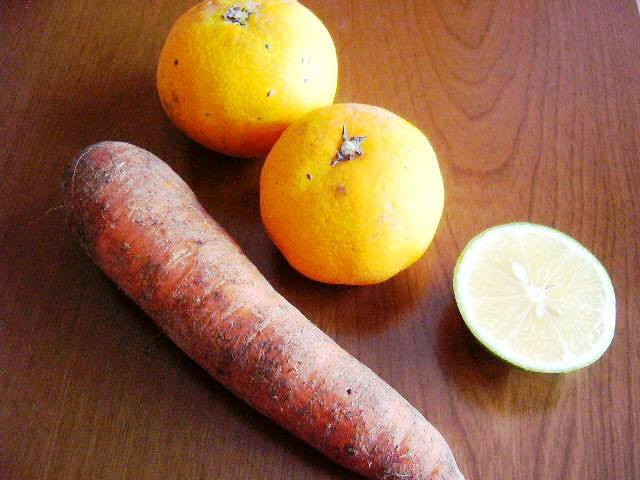 これで(ニンジン1本+ミカン小2個+レモン1/5個)、250CCのジュースが出来ました。ミカンは1個でもいいかも。