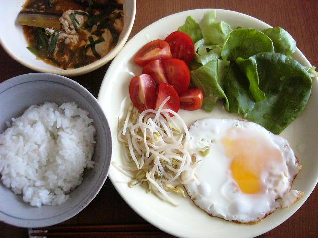 昨夜の残りマーボー、白米、トマト、レタス、もやしの炒め物、目玉焼き