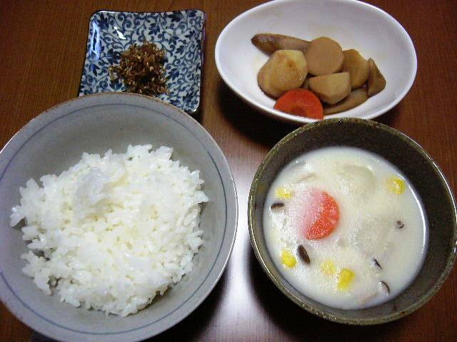 写ってないけど白米、サラダ菜、トマト、カボチャ、白身魚(シイラ)のパン粉焼き、牛蒡のポタージュ