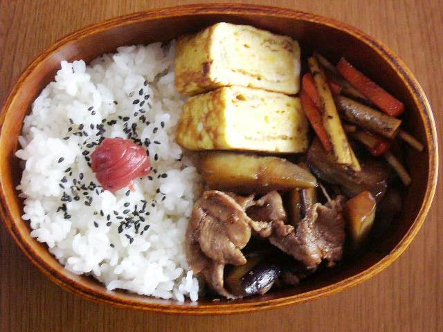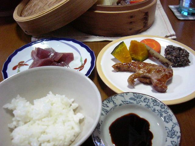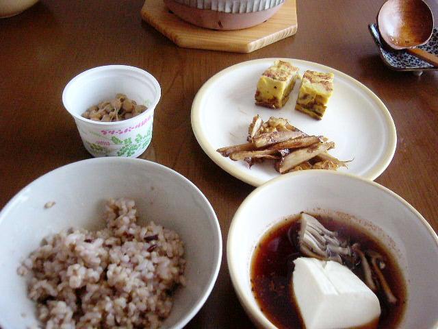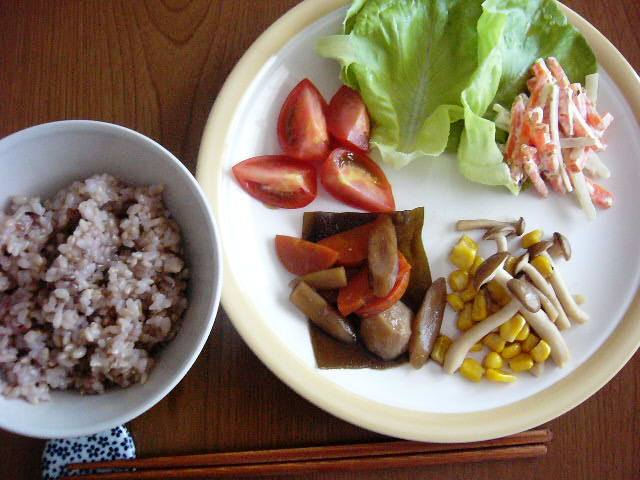 雑穀入り玄米、トマト、サラダ菜、牛蒡と人参のサラダ、昨日の残りの煮物、しめじとコーンのバター醤油炒め